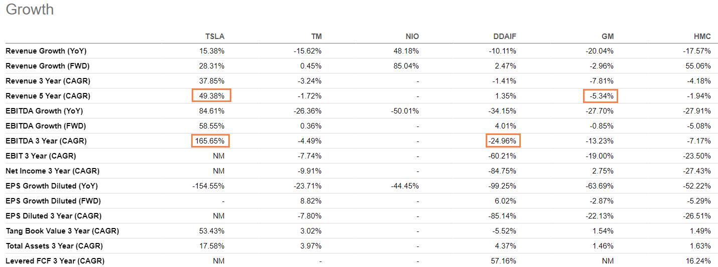 5년 평균 매출 성장률을 보면 테슬라는 거의 50%에 육박하는 게 보이시지요. GM은 마이너스 5프로입니다.