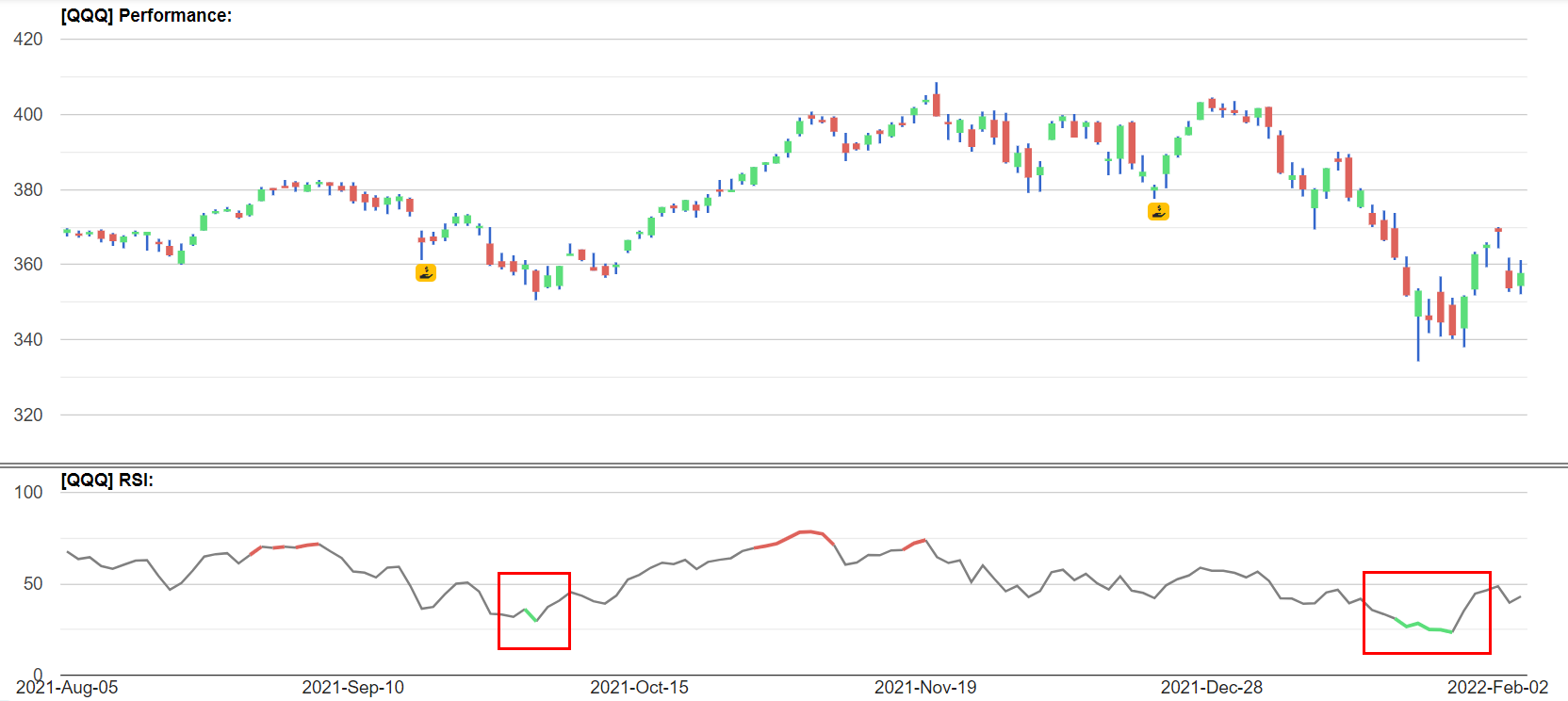 최근 QQQ의 RSI Indicator 인데, 제가 빨간 박스를 구간에 매수해도 괜찮은 성적이 나왔을 것 같습니다.